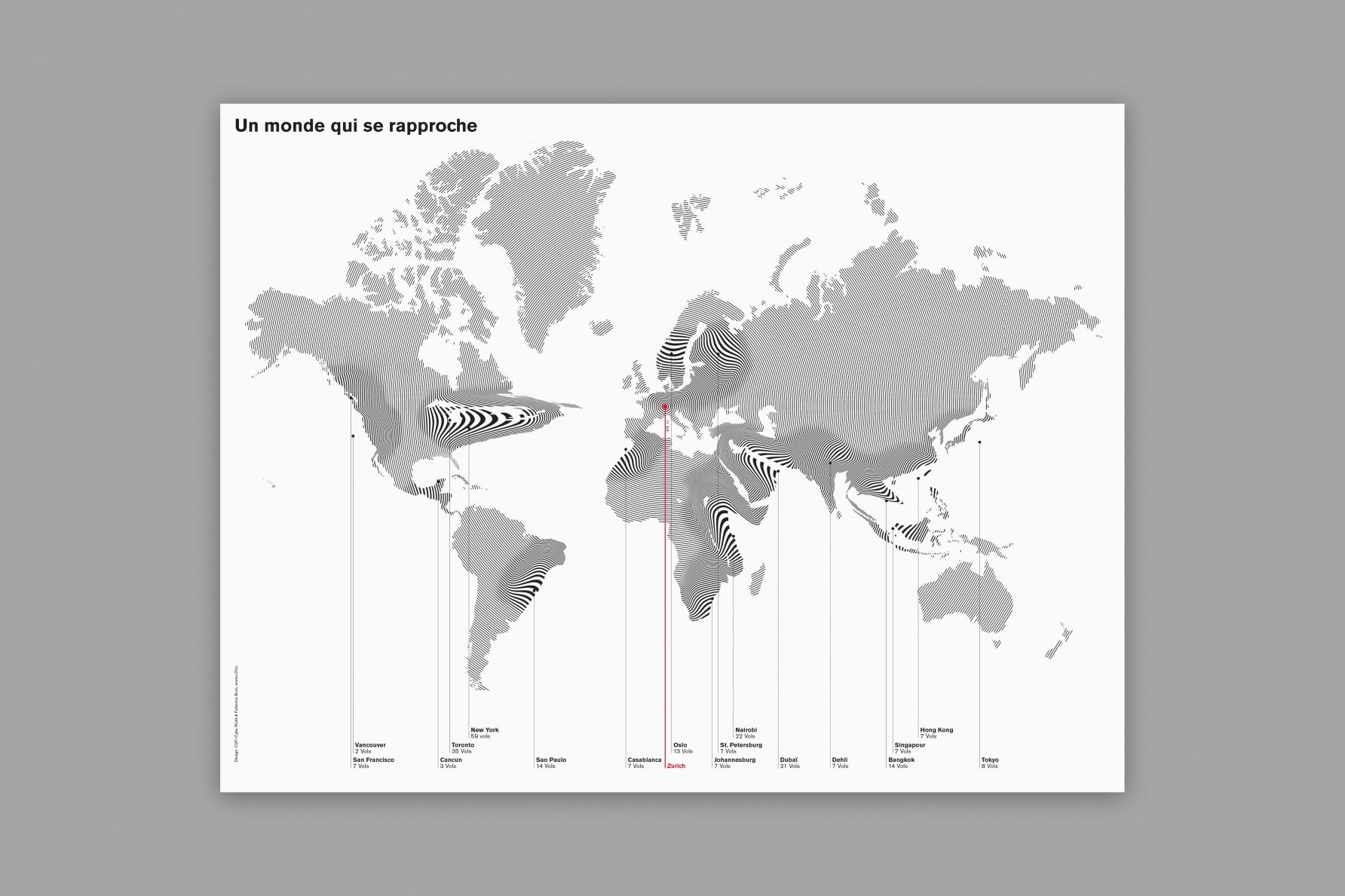 Für das Magazin Hémisphères der Fachhochschule Westschweiz haben wir diese deformierte Weltkarte kreiert. Die Karte zeigt die Zahl der wöchentlichen Flüge vom Flughafen Zürich nach einer Auswahl von Städten auf der ganzen Welt.
